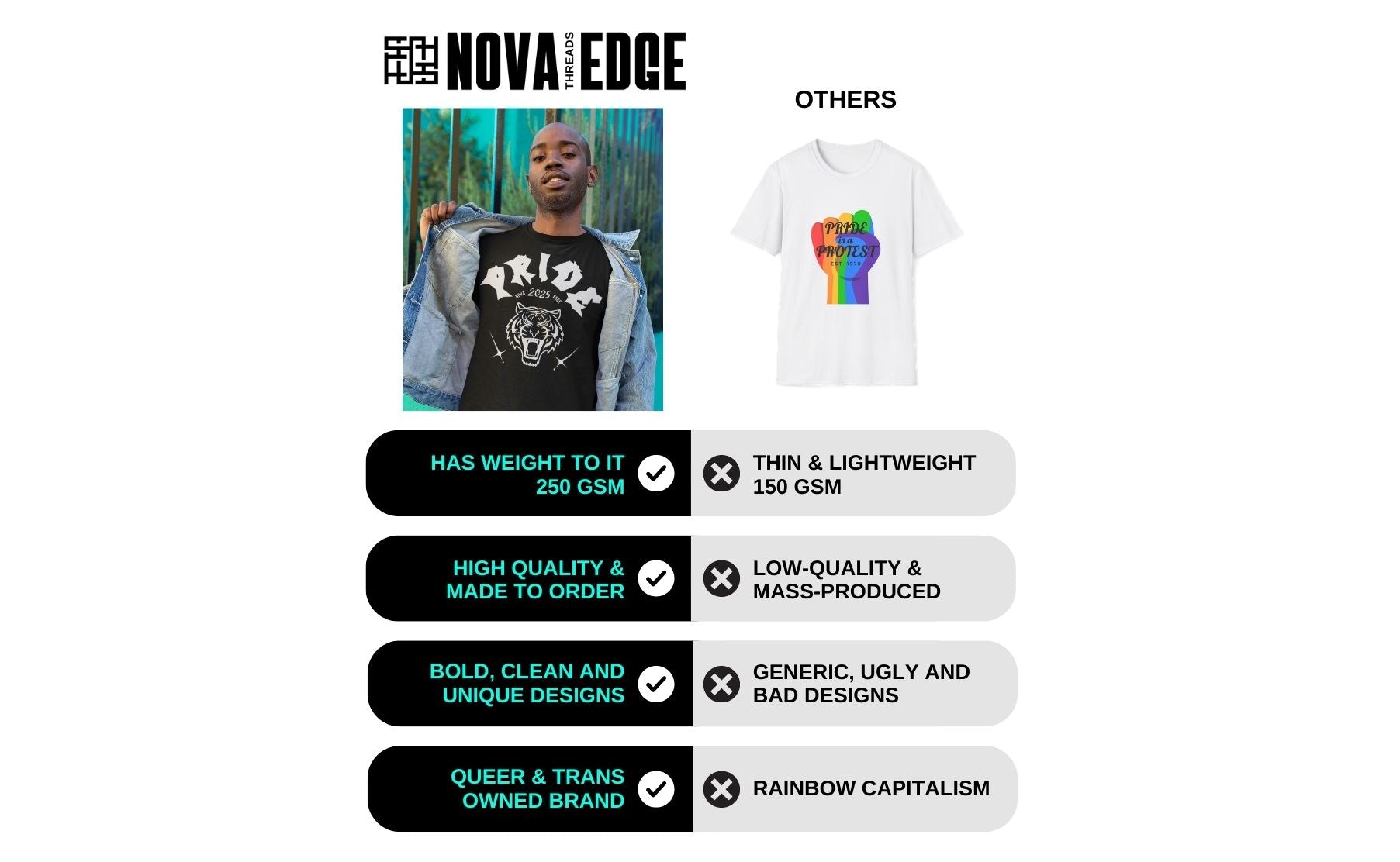 The bold unapologetic self-expression that fuels queer fashion today is rooted in the legacy of Black & Brown Women, especially Trans Women. Their courage, creativity & resistance have profoundly shaped the LGBTQIA+ rights and culture that we all proudly share today. The language, the lingo, the fierce delivery of shade that so many attribute to the Gay Community- is in truth- from the beautiful Black Women in our lives. From the ballroom to the frontlines of liberation, their ongoing contributions are invaluable. We honor them by committing to resourcing our community organizations who center the most marginalized in our communities.