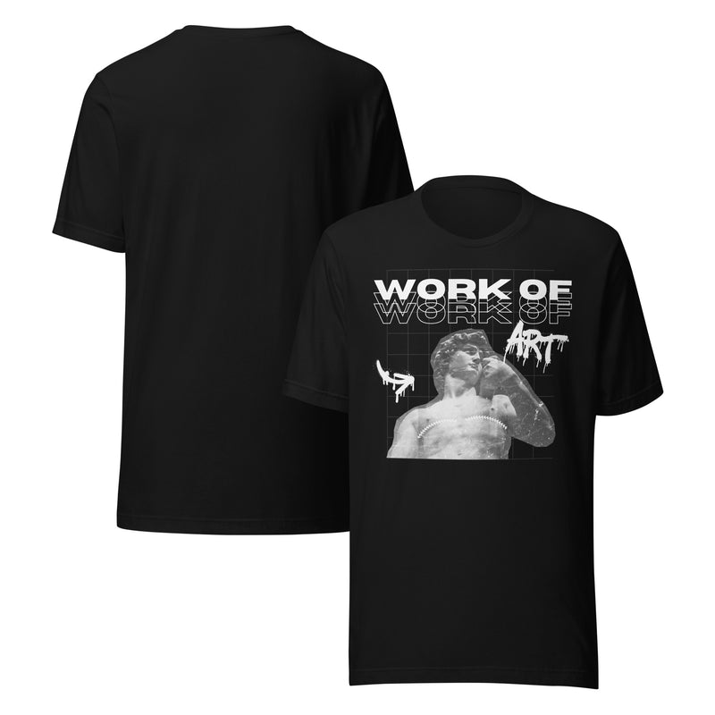Eres la obra maestra. La camiseta Obra de Arte presenta un atrevido gráfico de una estatua adornada con cicatrices de cirugías superiores, que honra la belleza transmasculina y la soberanía corporal a través de imágenes clásicas queer.